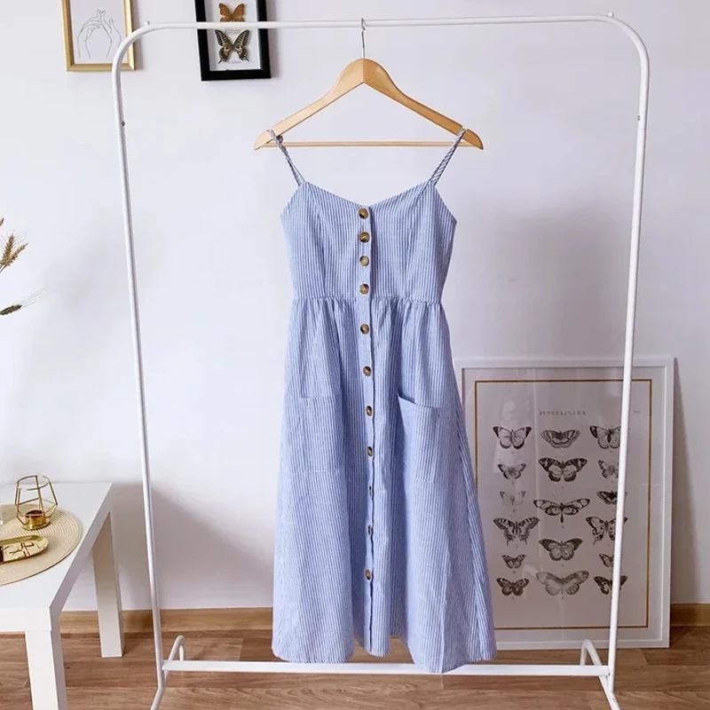 Product Name: Przed kobietami Boho sukienka kwiatowa 2019 letnie seksowne ramiączka kieszeń na guzik w paski sukienka plażowa damska Casual sukienki Sundress vestidos