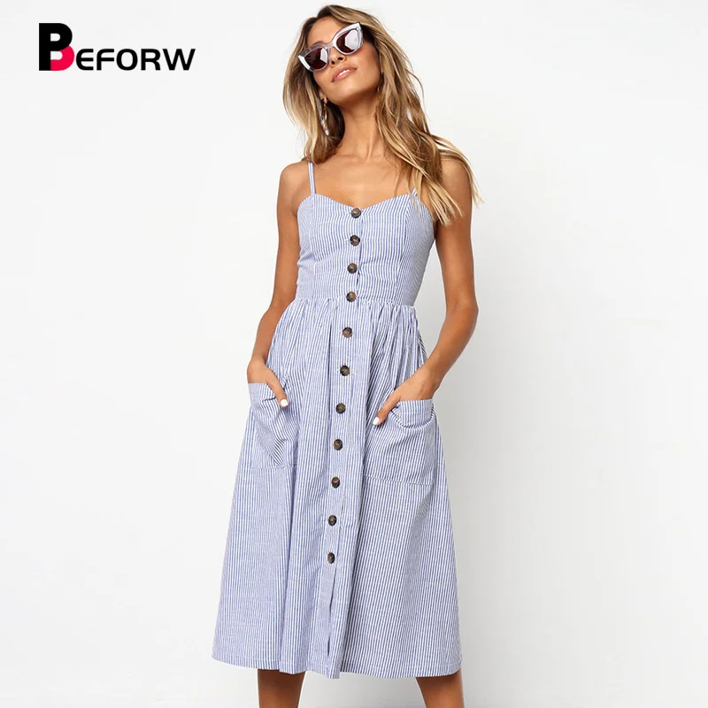 Special Offer Przed kobietami Boho sukienka kwiatowa 2019 letnie seksowne ramiączka kieszeń na guzik w paski sukienka plażowa damska Casual sukienki Sundress vestidos Discount 20% Today!