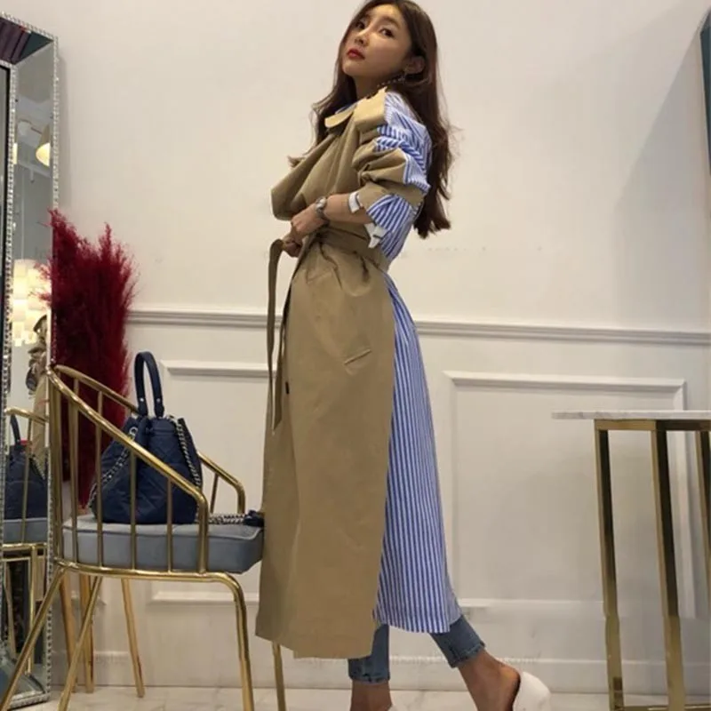 Product Name: TWOTWINSTYLE paski Patchwork wiatrówka dla kobiet z długim rękawem Lace Up trencz koreański mody 2019 jesień ponadgabarytowych
