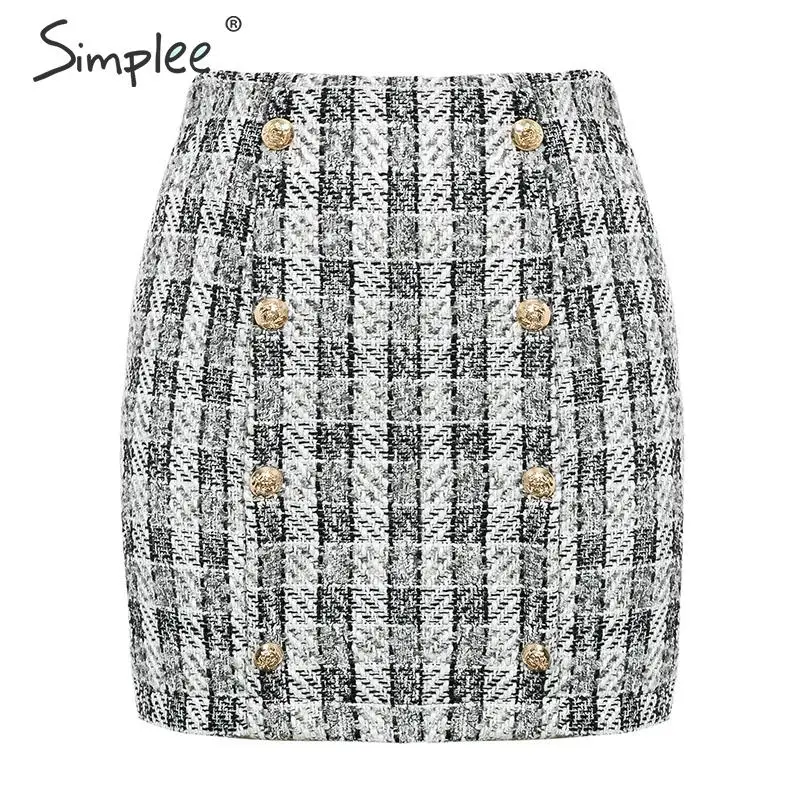 . (Zniżka 54%) Tanie Simplee dwurzędowy tweedowy plaid damski spódnica prosta elegancka biurowa, damska krótka mini spódniczka Vintage jesienna spódnica damska Cena.