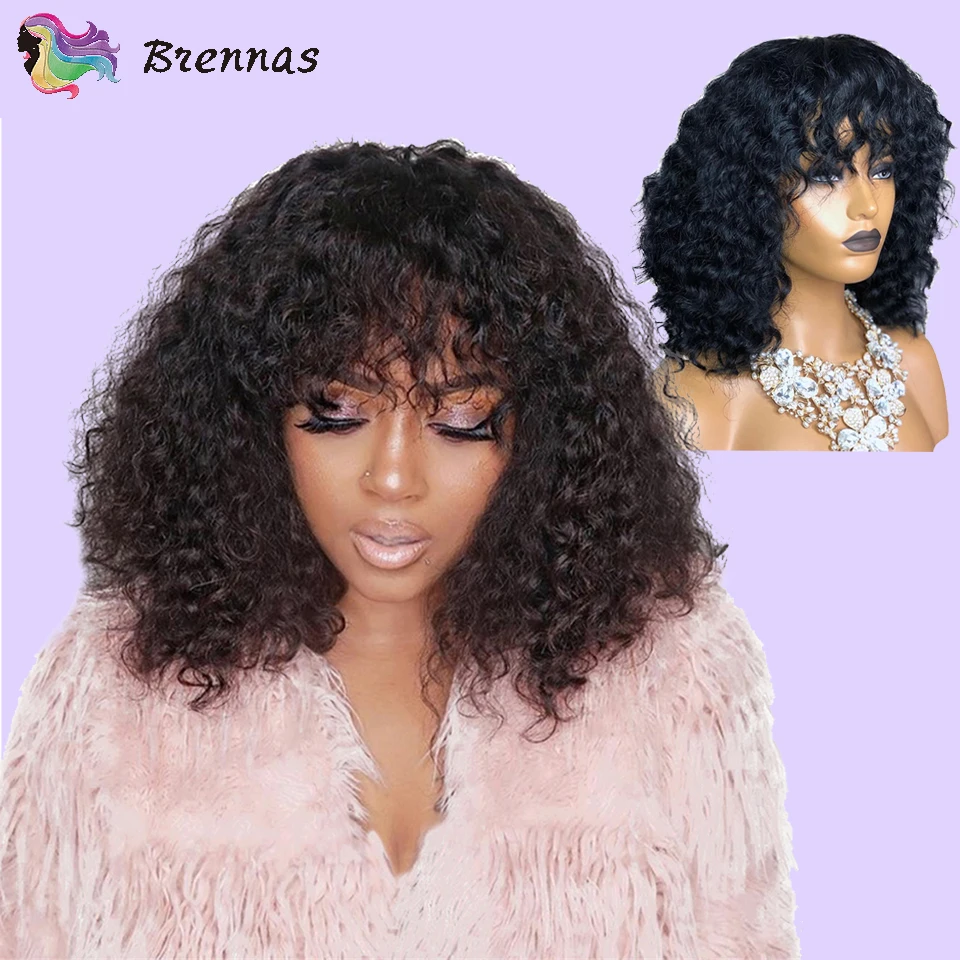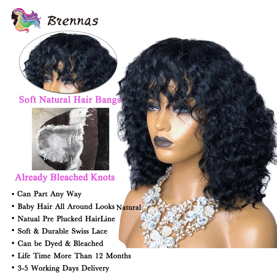 Special Offer Brennas ludzki włos koronki peruki krótki bob kręcone peruka z grzywką brazylijski Remy włosy 13X4 koronkowa peruka na przód 8 16 dla kobiet 150% gęstości Discount 40% Today!