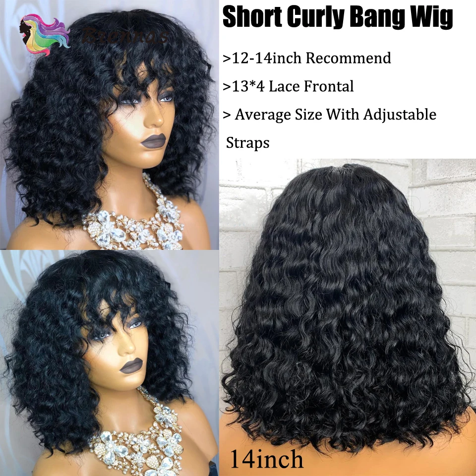 . (Zniżka 40%) Tanie Brennas ludzki włos koronki peruki krótki bob kręcone peruka z grzywką brazylijski Remy włosy 13X4 koronkowa peruka na przód 8 16 dla kobiet 150% gęstości Cena.