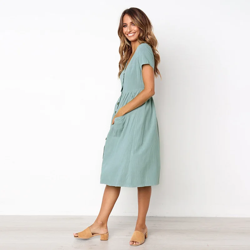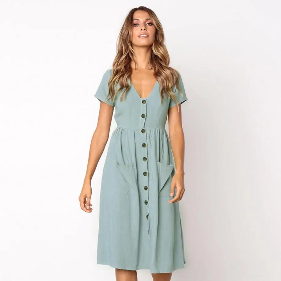 Special Offer Moda damska lato z krótkim rękawem V Neck w całości zapinana na guziki rozkloszowana średniej długości sukienka z kieszeniami damska sukienka plażowa kobiety Sundress Vestidos Discount 41% Today!