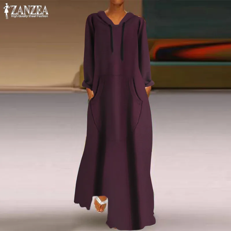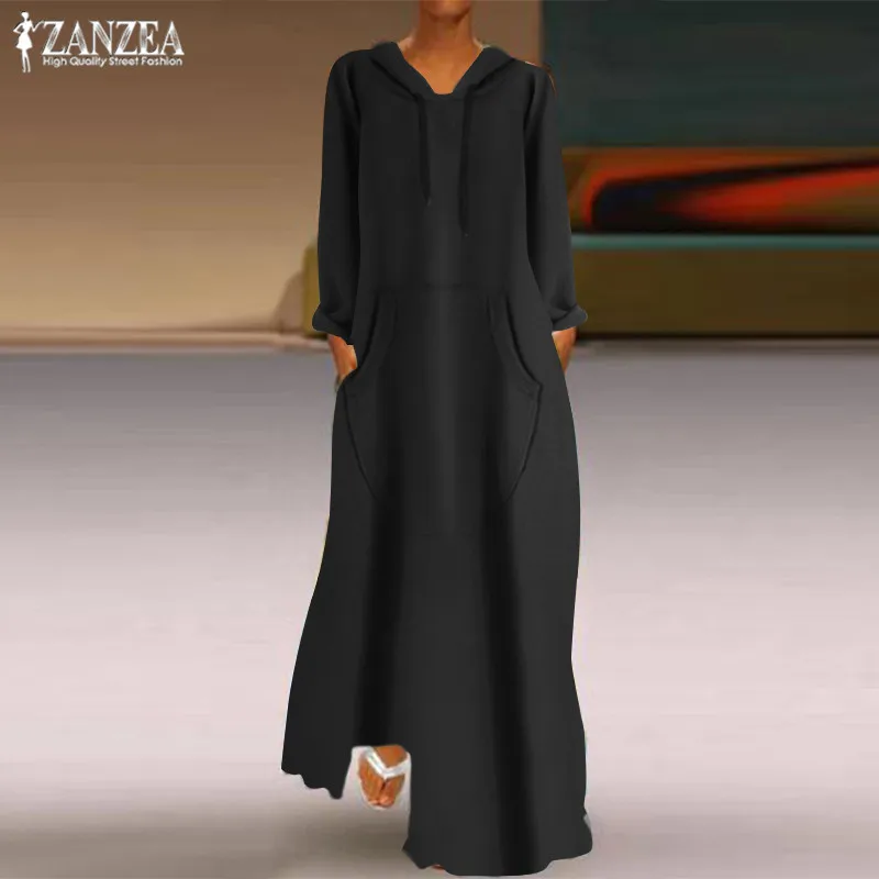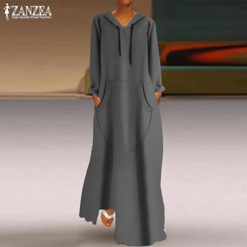 Product Name: ZANZEA sukienka z kapturem bluza 2019 kobiet z długim rękawem z polaru długie sukienki bluzy kobiet jednolity kolor, długi Vestido Plus Size Plullovers