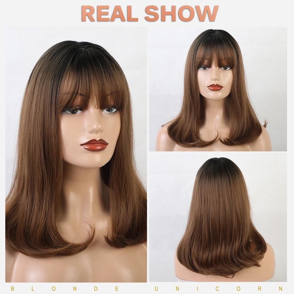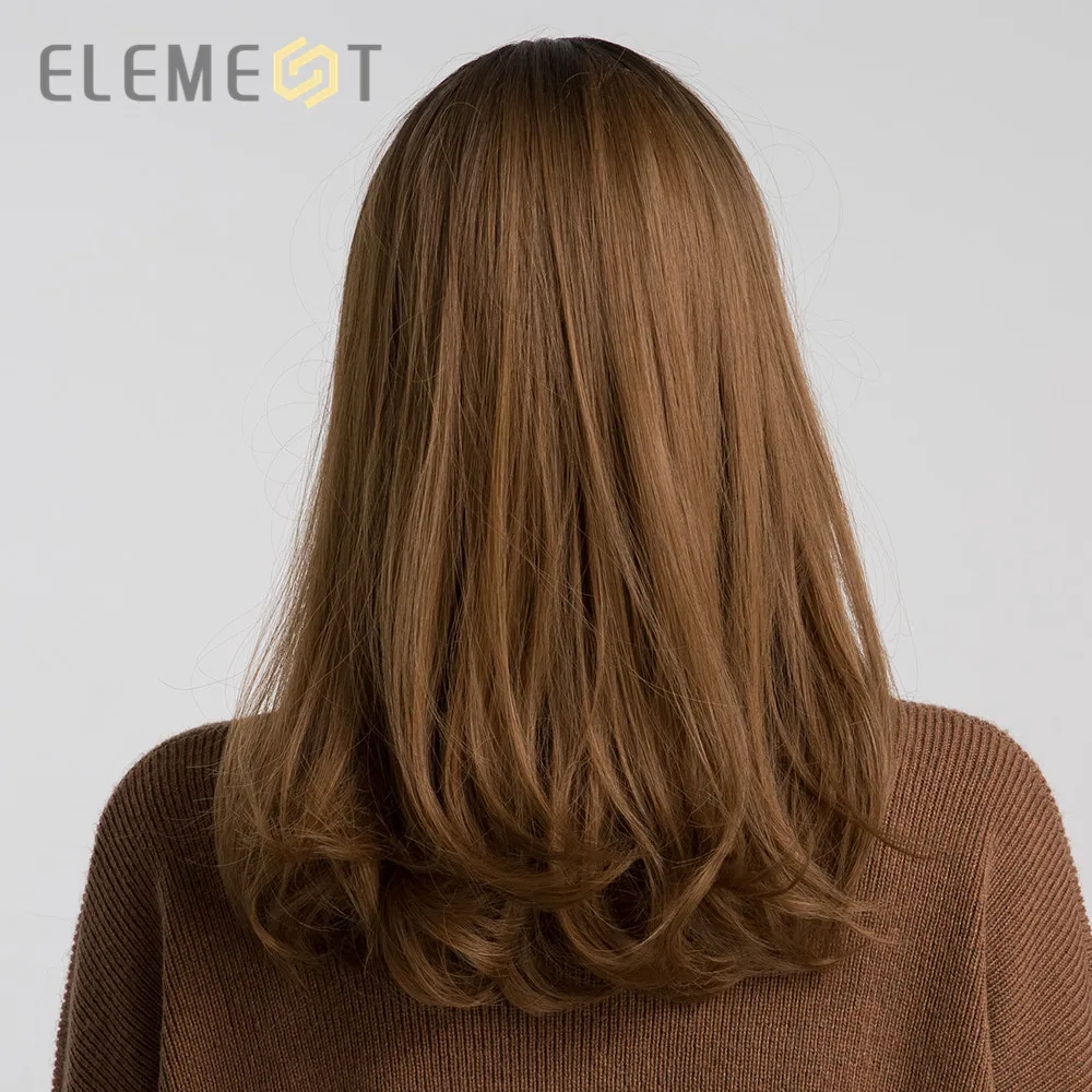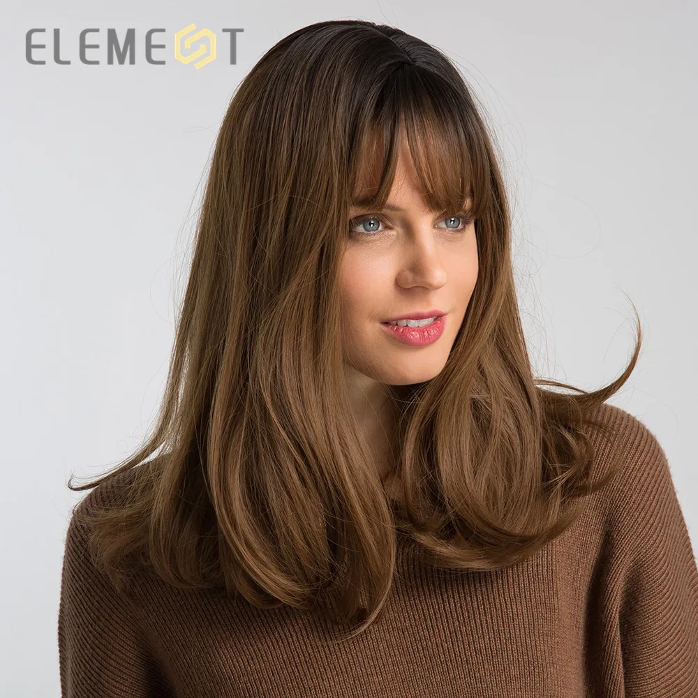 . (Zniżka 35%) Skup Element 16 Cal syntetyczna peruka z grzywką naturalny nagłówek Ombre brązowy kolor moda na imprezę cosplay wymiana peruki dla kobiet Najtaniej Cena.