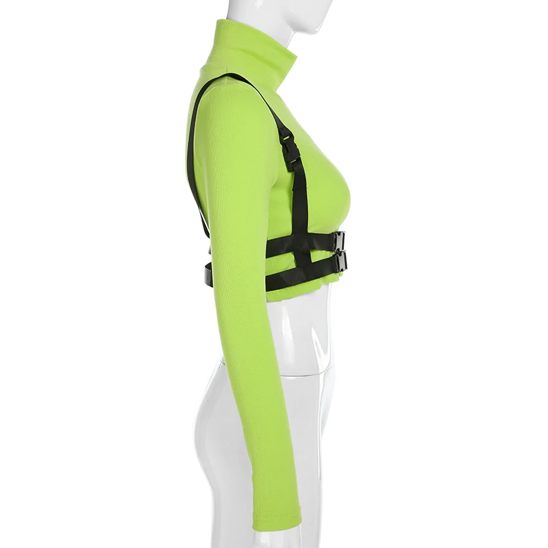 Product Name: Sweetown Neon kolor jesień Tshirt Patchwork klamra w stylu Safari koszulki z krótkim rękawem kobiety z dzianiny z dzianiny z golfem z długim rękawem Crop Top Tee koszula
