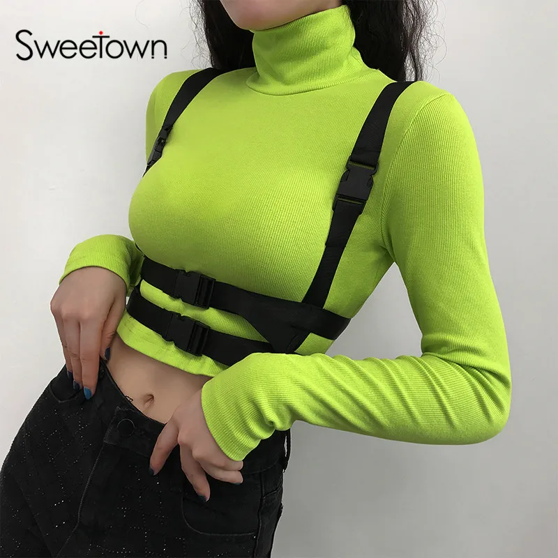 . (Zniżka 41%) Skup Tanie Sweetown Neon kolor jesień Tshirt Patchwork klamra w stylu Safari koszulki z krótkim rękawem kobiety z dzianiny z dzianiny z golfem z długim rękawem Crop Top Tee koszula Cena.