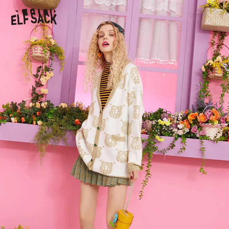 . (Zniżka 60%) Skup Tanie ELF worek V Neck grafika z tygrysem przycisk przód swobodny kardigan sweter kobiet ubrania 2019 jesień koreański styl swetry damskie Cena.