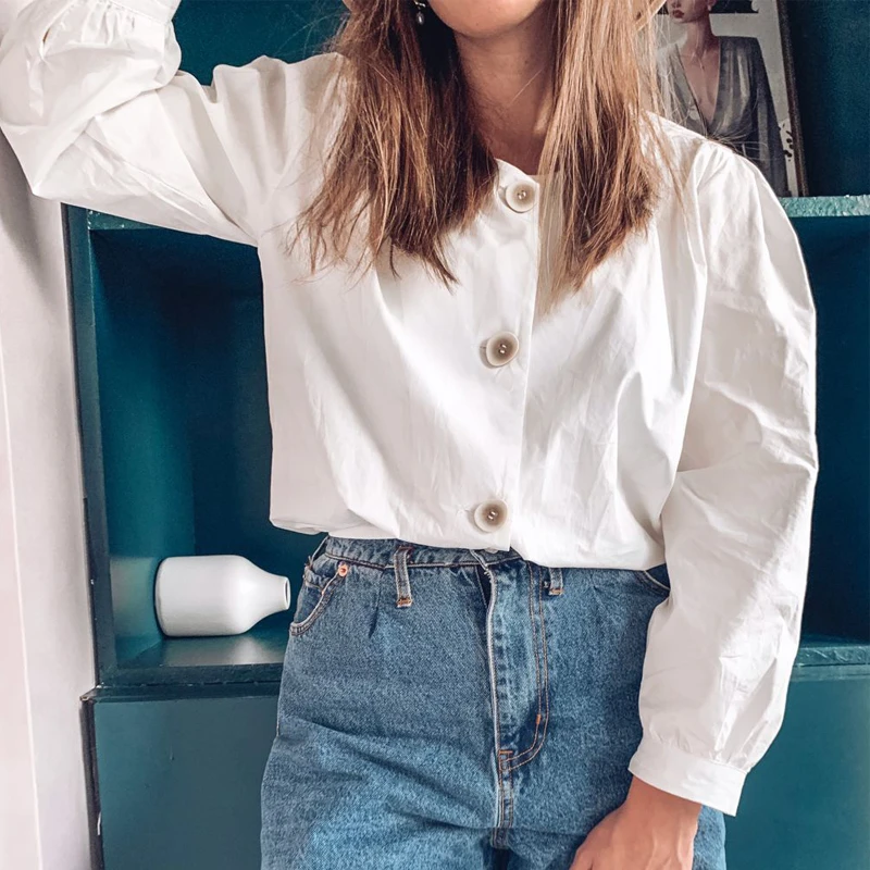 Product Name: Luźne latarnia rękaw biały bluzki topy kobiety pojedyncze piersi koszula V Neck plisowane topy awokado zielony koreański mody 2019