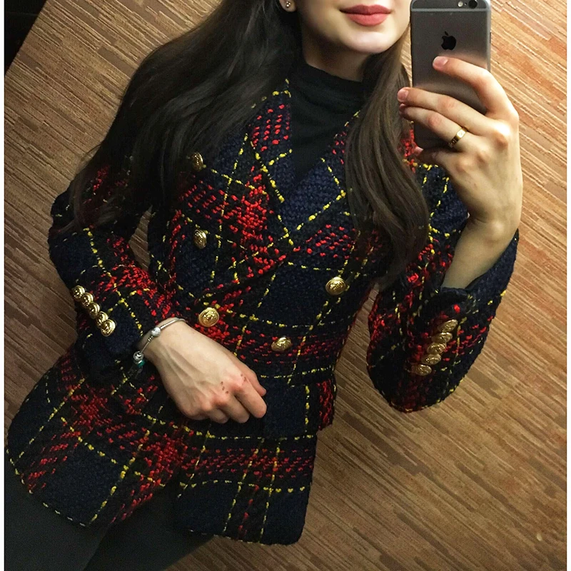 Special Offer Wysoka jakość nowy stylowy 2019 projektant marynarka damska podwójne piersi lew metalowe guziki Plaid Tweed wełna marynarka płaszcz zewnętrzny Discount 38% Today!