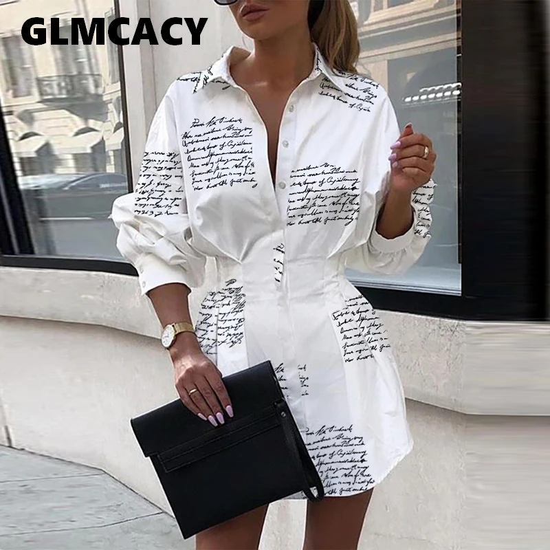 Special Offer Kobiety skręcić w dół kołnierz list koszula z nadrukiem sukienka z długim rękawem wysokiej talii zanurzyć sukienka elegancki guzik projekt sukienki Vestidos Discount 40% Today!