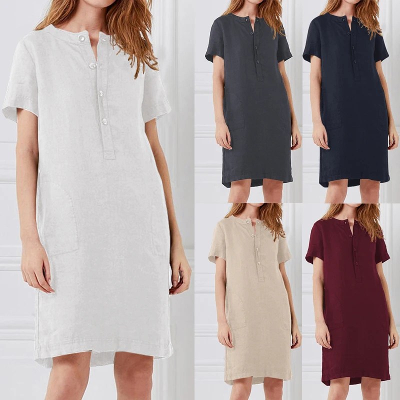 Product Name: Letnia lniana sukienka 2019 Celmia kobiety tunika koszulka z krótkim rękawkiem przycisk kobieta w stylu Vintage Casual Sundress Sarafans Vestidos S 5XL