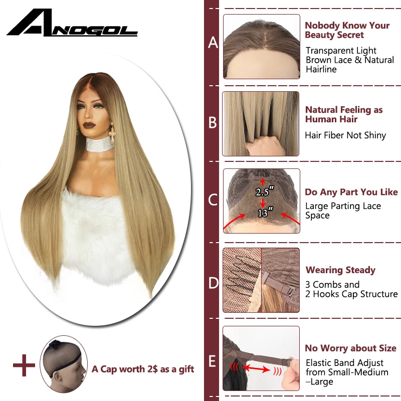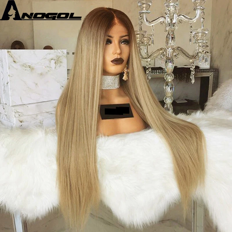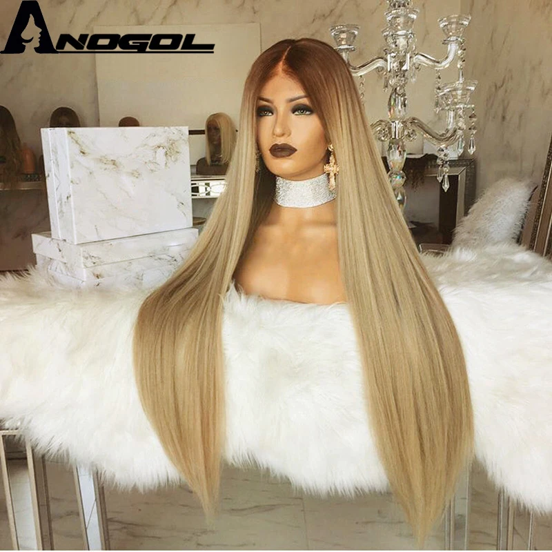Special Offer Anogol wysokiej temperatury włókna 360 Frontal długie proste brązowy Ombre blond z futerkiem peruki syntetyczna koronka peruka front dla kobiet Discount 35% Today!