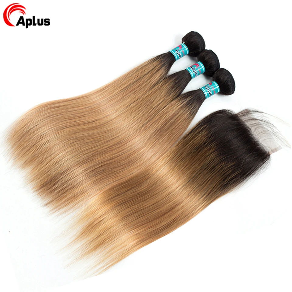 Product Name: Model opony Aplus włosy peruwiański Ombre wiązki z zamknięciem prosto 1B 27 miód blondynka wiązki z zamknięciem NonRemy ludzkie włosy wyplata zamknięcie
