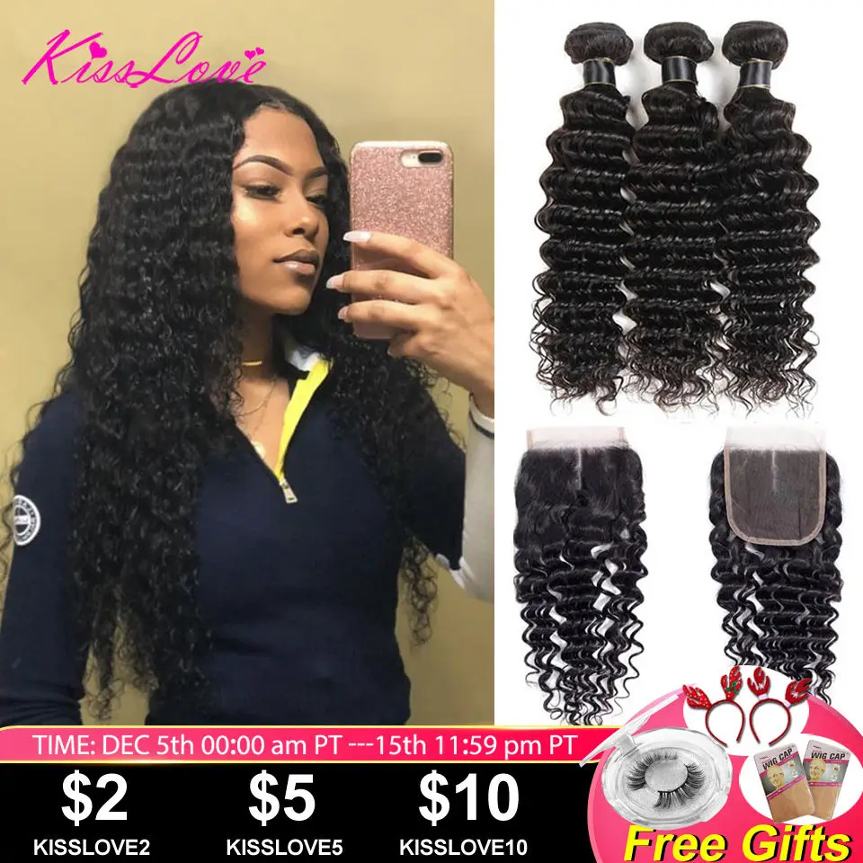 Special Offer Pocałunek miłość brazylijskie włosy głęboka fala wiązki z zamknięciem ludzkie włosy wyplata 3 wiązki z zamknięcie koronki średni stosunek Remy włosy Discount 43% Today!